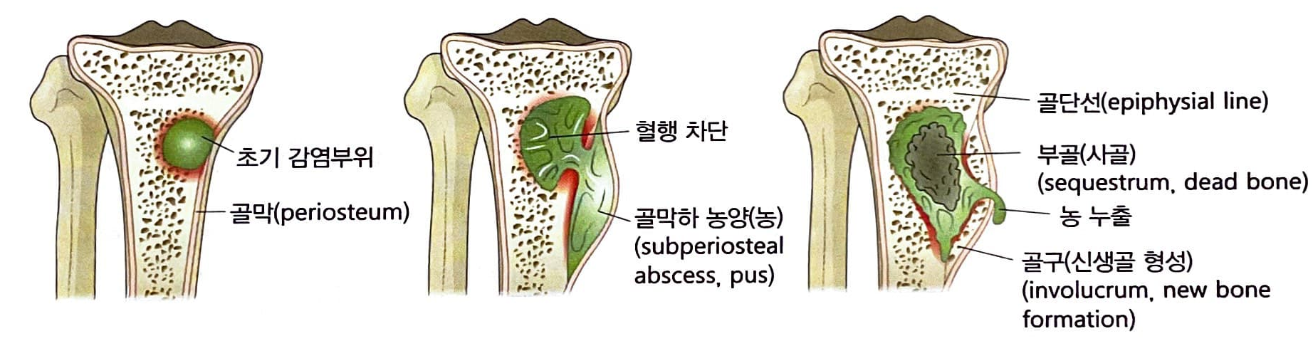 골수염의 대부분은 균이 혈관을 따라서 신체를 돌아다니다가 뼈를 감염시키게 되는 혈행성 골수염입니다.  성장판이 있는 소아청소년기의 경우에는 성장판 주위의 골단단부에서 뼛속의 혈유가 속도가 느려지게 되어 세균이 그 주위로 침투가 쉬워지기 때문에, 소아청소년기에는 성장판 주위에 골수염이 흔하게 발생한다.