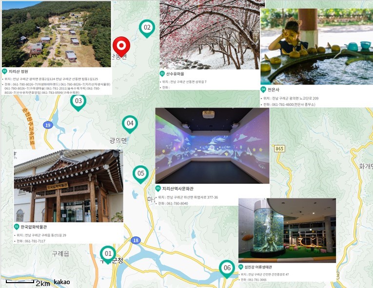 한국압화박물관 - 산수유마을 - 지리산정원 - 천은사 - 지리산역사문화관 - 섬진강어류생태관