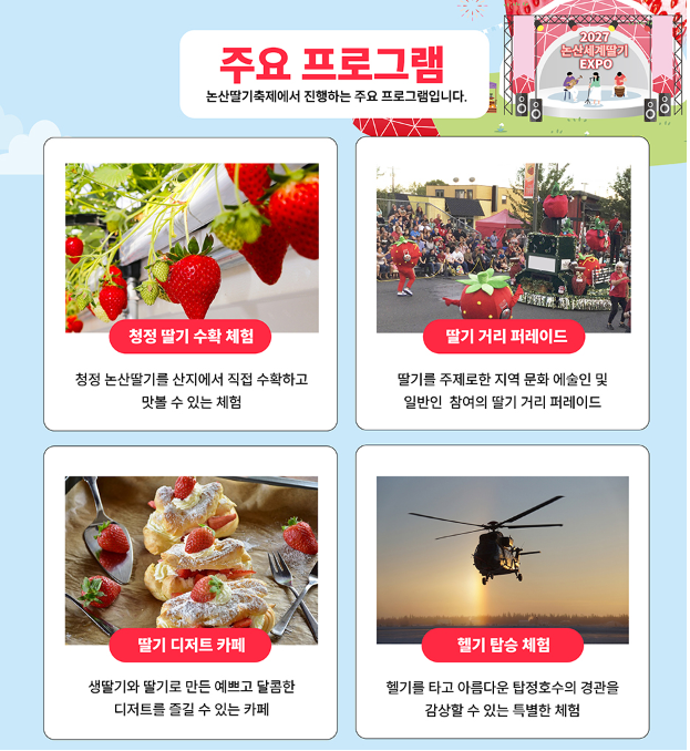 올해는 '논산 딸기와 사랑에 빠지다'라는 달콤한 주제를 모토로 축제가 진행된다. 딸기 모형의 무대, 딸기 디저트 카페, 가족들간의 쉼터를 위한 피크닉 존, 어린이들의 재미를 위한 과학 체험키즈존, 타이탄 퍼포먼스 등의 비롯한 키즈프로그램 등의 다얗안 프로그램들을 선보 인다. 논산에는 논산훈련소가 위치해 매년 많은 신병들과 가족들이 찾아 오는 곳이기도 하다. 이번 축제에는 육군항공학교와 함께하는 헬기탑승체험, 헬기전시 체험 프로 그램등 의 국방친화적인 콘텐츠도 마련되어 있어, 먹거리와 볼거리 즐길거리가 풍성한 축제가 될 것으로 기대된다.